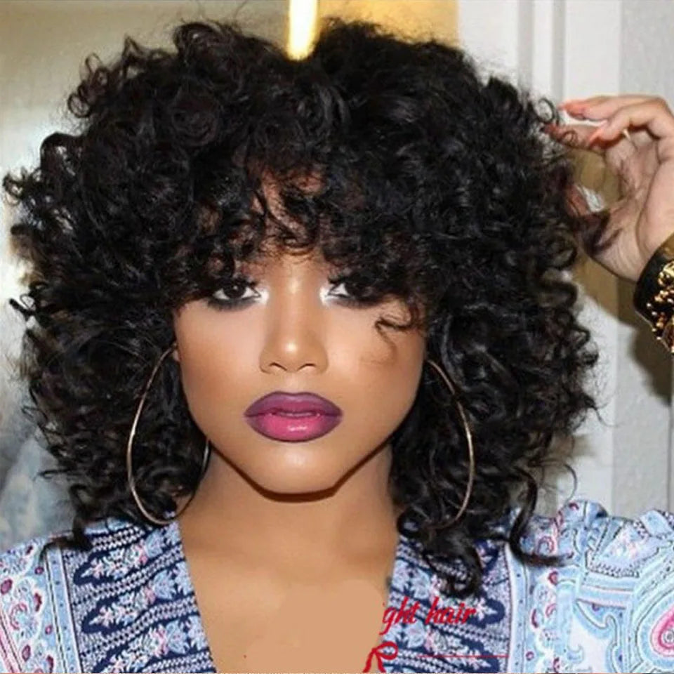 Embrace playful elegance with our afro curly bouncy bob wig featuring bangs, made from 100% Brazilian Remy human hair. This glueless wig offers a fun, stylish look that's easy to wear and maintain. The bouncy curls and chic bob cut make it perfect for adding volume and character to your appearance.